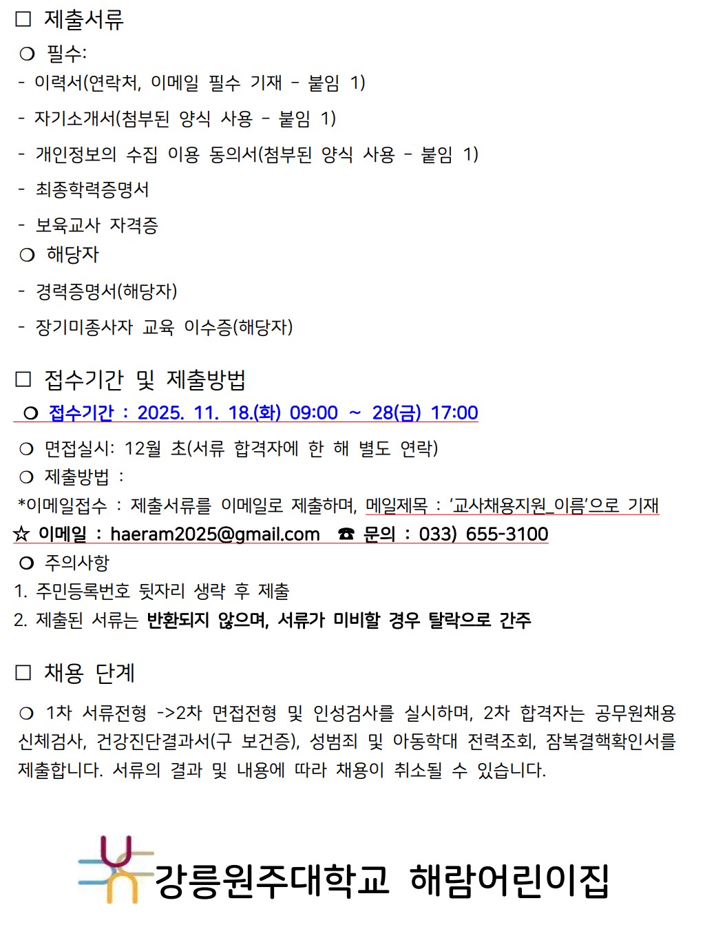 2023년 강릉원주대학교 해람어린이집 교사 채용공고
