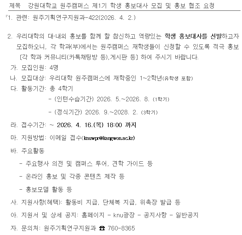 강원대학교 원주캠퍼스 제1기 학생 홍보대사 모집 및 홍보 협조 요청